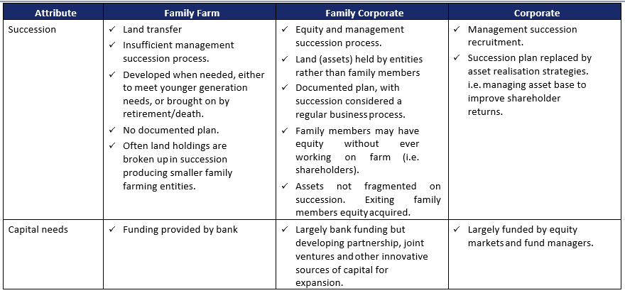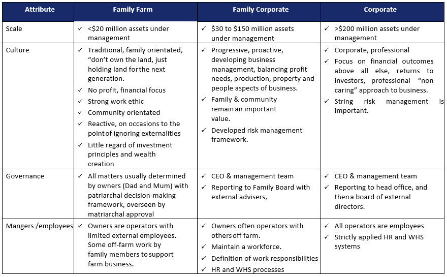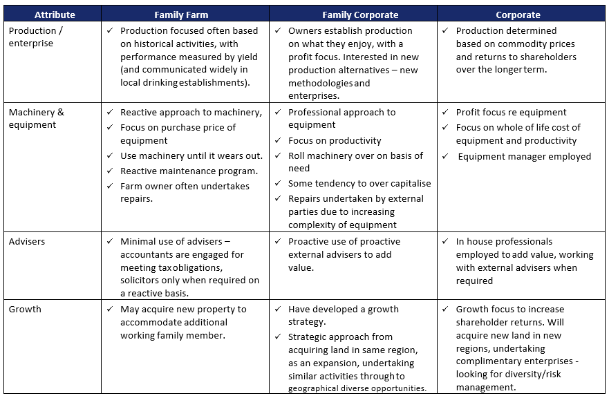 The key attributes of the defined farming structures are suggested below. In preparing this document we have considered many attributes of traditional, family corporate and corporate farm business models. In doing so, we have considered the traditional family farming model across Australia, rather than considering our client base. PrincipleFocus has worked with our client base to educate and implement many attributes that are more prevalent in the family corporate business model. That is, we have been working behind the scenes to migrate our clients to a culture and business management framework of family corporates. However, attributes that many of our client exhibit that keep them in the traditional family farming model are: they want to be; scale; a minimal growth mentality; access to capital; a succession framework (or lack thereof)